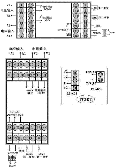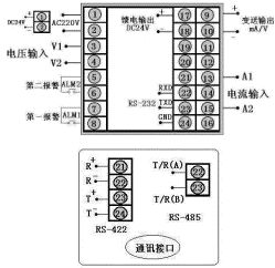 | 交流電壓表,輸入類型為0~5A,繼電器控制輸出,帶RS-485通訊,帶上限繼電器報警輸出,帶DC24V饋電輸出。 |