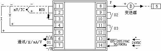 通訊(O1)+報警(O2)+報警(O3)+(1~5)V變送輸出(O4)
