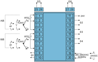 3. 全分度號輸入,能同時適配于各種分度號的熱電偶、熱電阻、電壓信號、電流信號和遠(yuǎn)傳壓力表。