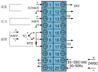 通訊/打印(O1)+控制輸出(O2)+(4~20)mA變送輸出(O3) |