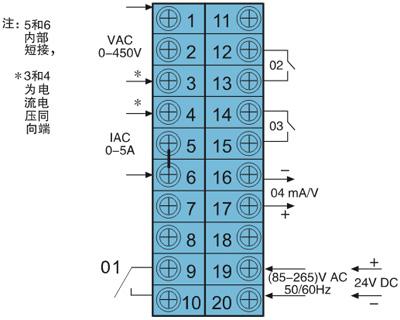 注:信號輸入為電流時,繼電器輸出為O1、O2;信號輸入為電壓時,繼電器輸出為O1、O3