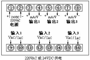 由220VAC或24VDC供電,將輸入的三相交流電流或電壓信號轉換為三路