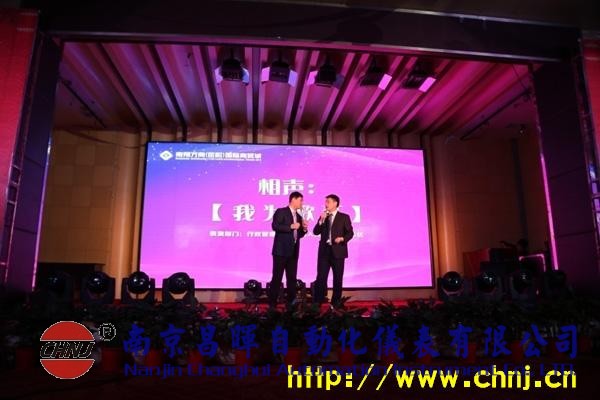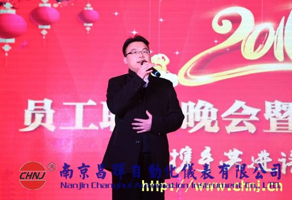 上圖為:聯(lián)歡晚會(huì)上南京昌暉公司總經(jīng)理王斌致辭。